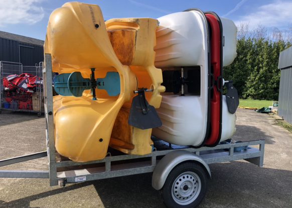 De waterfietsen zijn niet al te groot en daardoor makkelijk met 2 personen te tillen. Wij beschikken over een aanhanger, die met het standaard B-rijbewijs mag worden gereden, waarop 4 waterfietsen liggen. Een makkelijke manier van vervoeren dan een hoop logistieke rompslomp voorkomt.