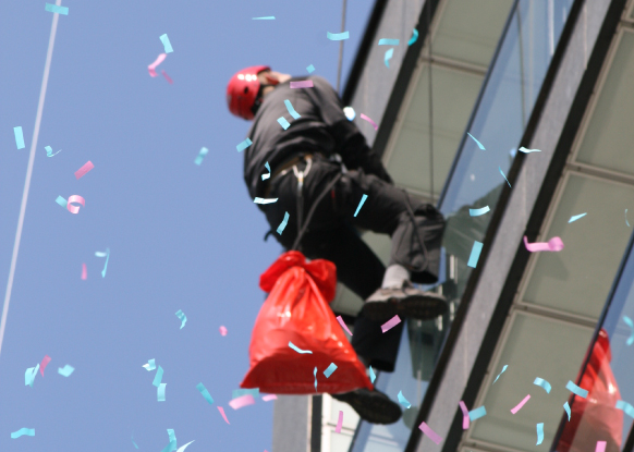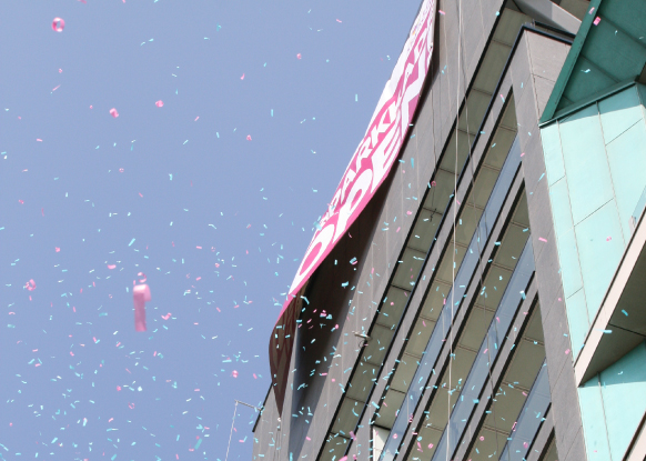 Na het openingswoord door de betrokken partijen werden er aan de voorkant van het gebouw 2 trossen ballonnen losgeknipt. De ballonnen werden via een touw naar boven geleid. Éénmaal boven aangekomen verschenen er 2 abseilers welke een aantal meters afdaalden om vervolgens een grote banner te onthullen. Met het vallen van het doek gingen er diverse confettikanonnen af en was de opening een feit!