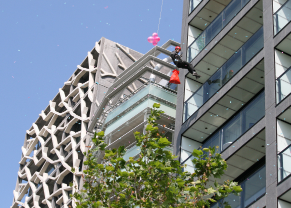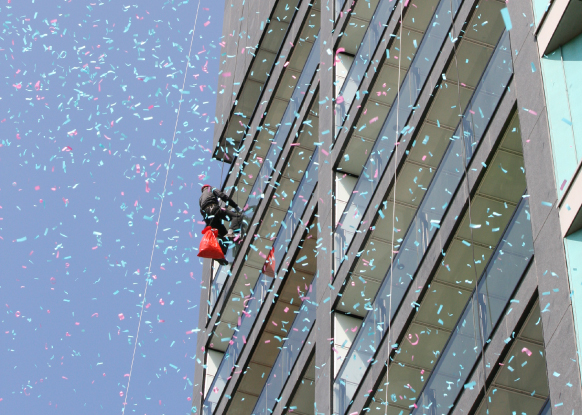 Een voorbeeld van een door ons verrichte opening van een appartementencomplex in Lelystad met een hoogte van 50 meter: